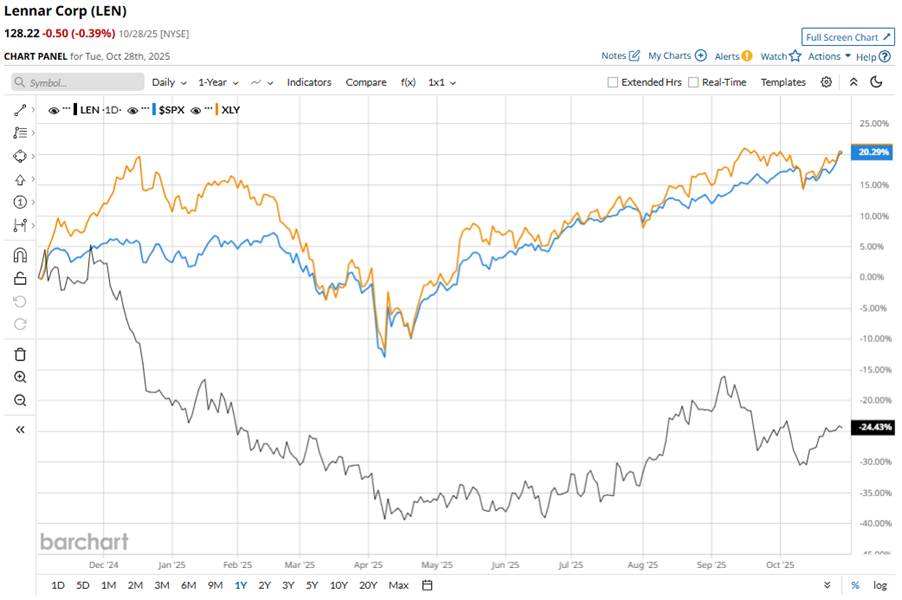 LEN stock has declined 26.4% over the past 52 weeks, considerably underperforming both the S&P 500 Index’s ($SPX) 18.3% return and the Consumer Discretionary Select Sector SPDR Fund’s (XLY) 19.8% uptick over the same time frame.