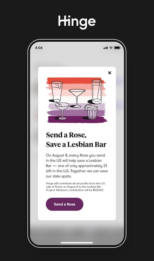 As part of the initiative, Hinge will educate its users about the importance of such establishments and encourage them to send a “Rose,” the app’s version of a “super like.” One rose cost’s $3.99, and all proceeds from the sales on August 8 will go to The Lesbian Bar Project, with Hinge committing to donate a minimum of $50,000.