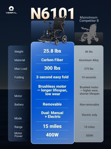 - Weight — Verpal carefully selects lighter and stronger materials, such as carbon fiber, for constructing wheelchair frames. This significantly reduces the overall weight of electric wheelchairs, with the lightest model weighing only 25.8 lbs.