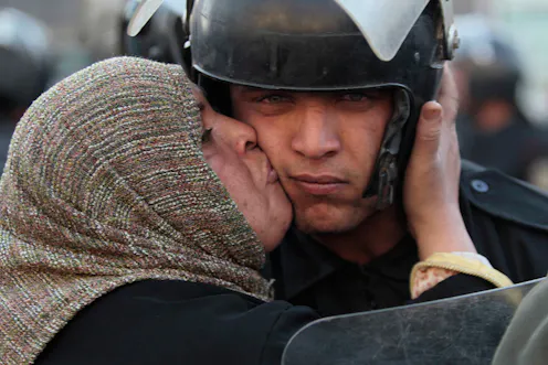 The iconic image of an older Egyptian woman kissing a male Egyptian officer on the cheek to shame the police for their brutal actions against demonstrators remains one of the strongest symbols of the revolution.