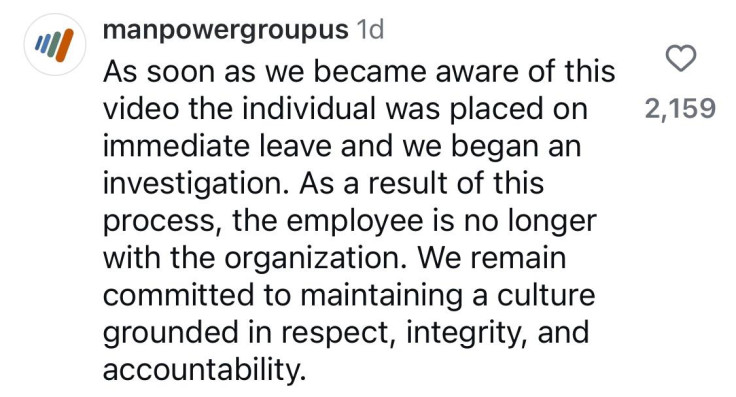Within 24 hours of the video surfacing, ManpowerGroup, a Milwaukee-based staffing firm, confirmed Kobylarczyk was 'no longer with the organisation'. In a statement to CBS Los Angeles, the company said it 'does not condone discriminatory behaviour of any kind, either inside or outside the workplace'.