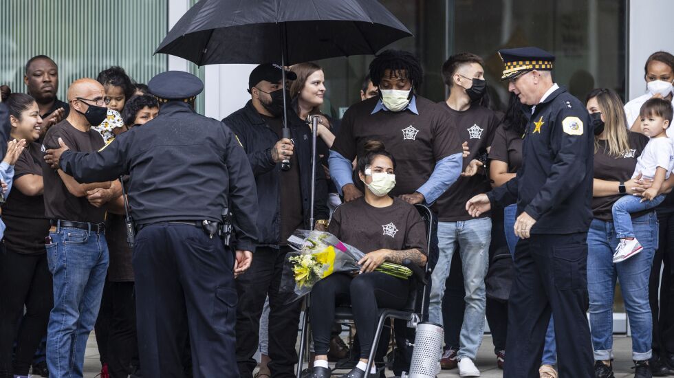 As Fernanda Ballesteros, one of the Chicago police officers shot last week, left the University of Chicago Medical Center Monday to a cheering crowd, Police Supt. David Brown called on Congress “to come up with some sensible gun laws.”