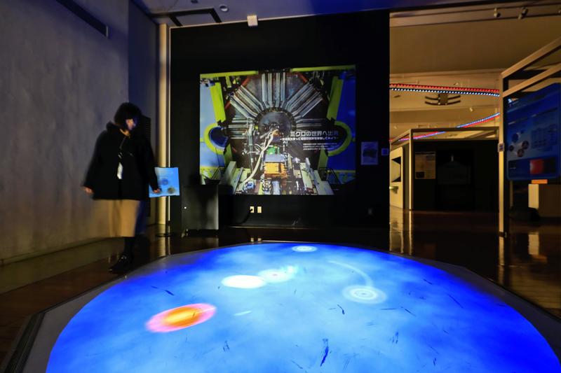 On the nearby floor in the plaza is a monitor with a diameter of 3 meters. Called the "Wonder Quark," it allows visitors the opportunity to experience being inside a proton that creates matter. If you step on this monitor, three balls with red, blue and green colors emerge. If you kick one of the balls to hit another, the color changes. The ball represents a quark, and the changing color simulates a "sea quark" in which quarks drift within a proton.