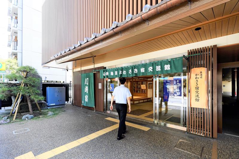 The four-story building with a green noren shop curtain hanging at the entrance memorializes Kawasaki Shuku Station, one of the 53 stations of the Tokaido main road linking Kyoto with Edo (now Tokyo). The route was a bustling transportation artery in the Edo period (1603-1867).
