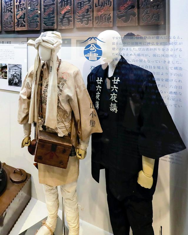 Kamiyoshida in particular could be conveniently reached from Edo, present-day Tokyo. At one time, the town had about 90 inns providing lodging to pilgrims. In an exhibition space made to re-create the Kamiyoshida of old, about 100 items are on display, including Buddha statues offered by pilgrims on the mountain, the white outfit worn by pilgrims and an Edo-period guidebook describing routes from Edo to Mt. Fuji.