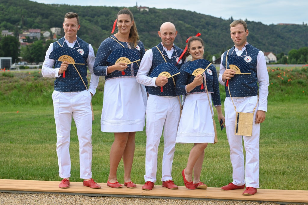 Count Brown among the fans of the Czech uniforms, done by Zuzana Osako in Prague. They include the team's mainstay, a gymnast, built into the design. Men will be in blue vests with white pants and women in blue blouses and white skirts.
