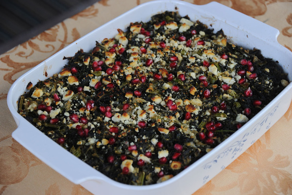 Packed with plenty of kale and perfumed with dill and mint, it's earthy in flavor and style and sits on a layer of cornmeal. Creamy feta and grated mozzarella cheeses soften the kale's rough textures while red pepper flakes cut the greens' bitterness by lending some heat. Pomegranate seeds not only brighten the slab pie's appearance for a photo-op but also add a slight sweetness.