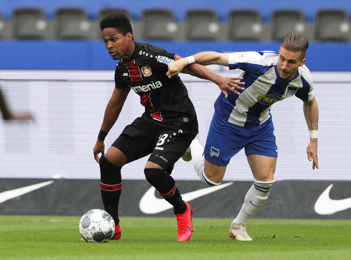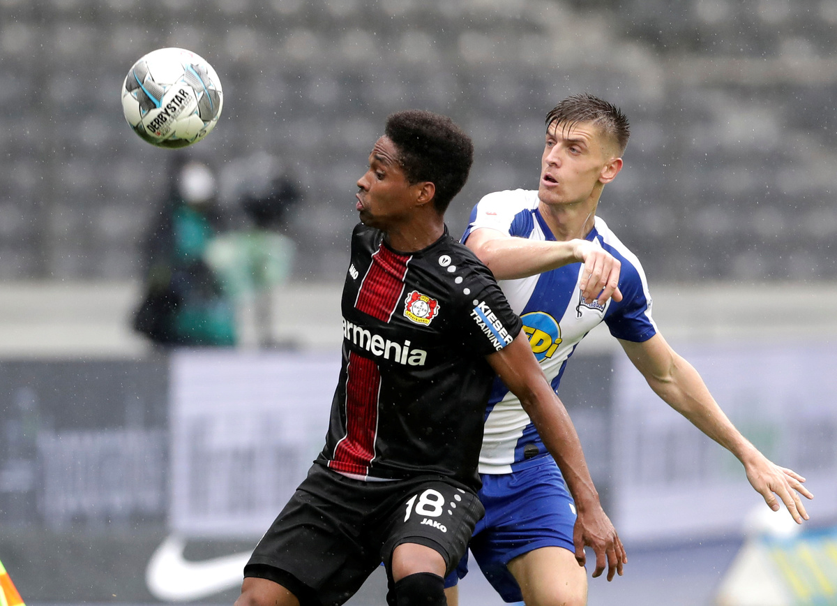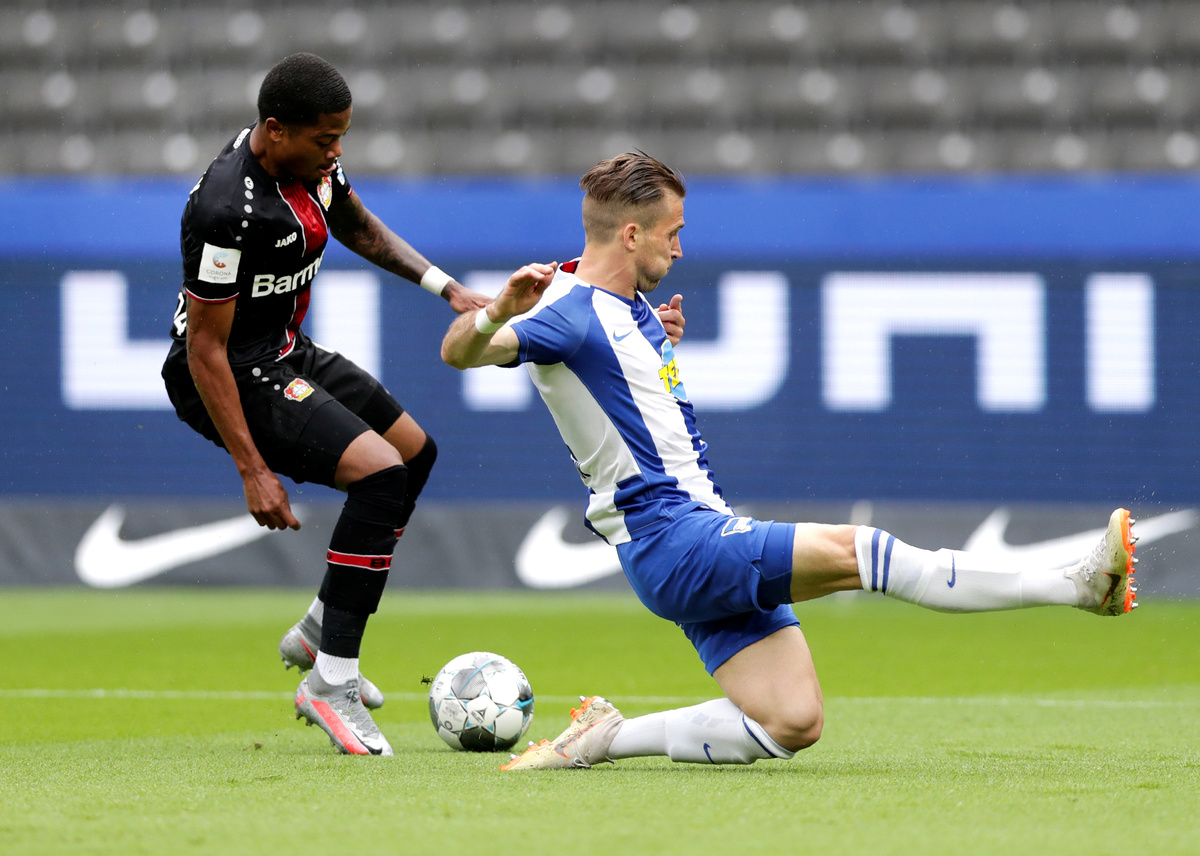 Soccer Football - Bundesliga - Hertha BSC v Bayer Leverkusen - Olympiastadion, Berlin, Germany - June 20, 2020 Berlin's Peter Pekarik in action with Leverkusen's Leon Bailey, following the resumption of play behind closed doors after the outbreak of the coronavirus disease (COVID-19) Michael Sohn/Pool via REUTERS Soccer Football - Bundesliga - Hertha BSC v Bayer Leverkusen - Olympiastadion, Berlin, Germany - June 20, 2020 Berlin's Peter Pekarik in action with Leverkusen's Wendell, following the resumption of play behind closed doors after the outbreak of the coronavirus disease (COVID-19) Michael Sohn/Pool via REUTERS