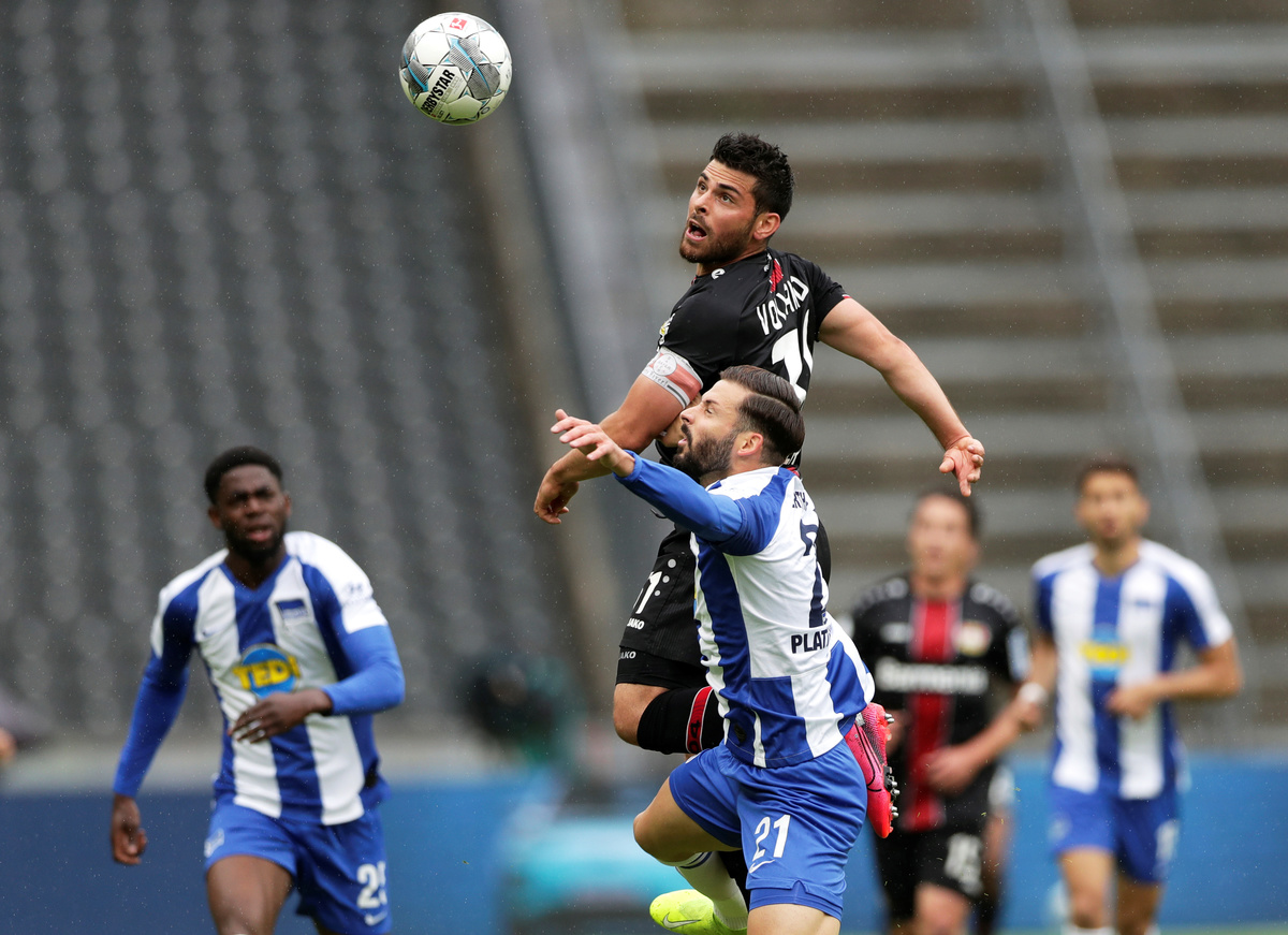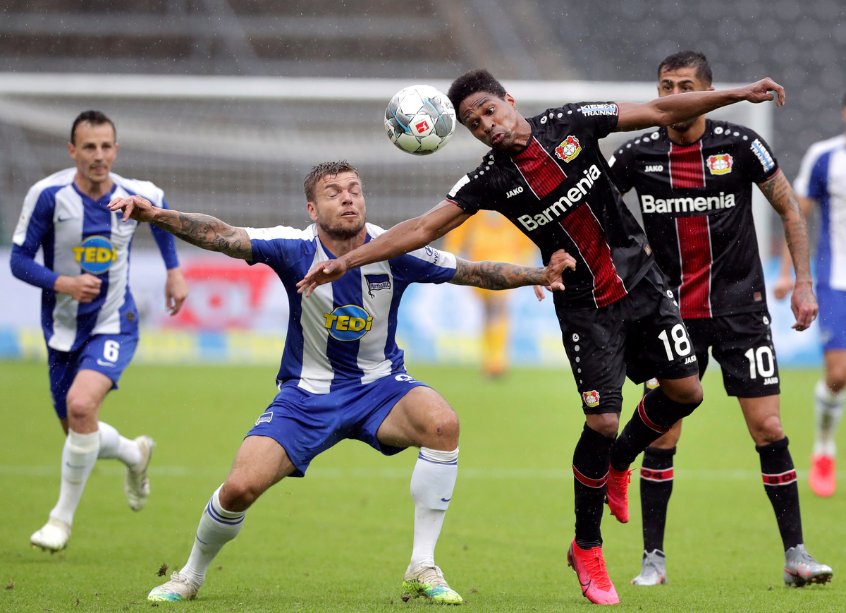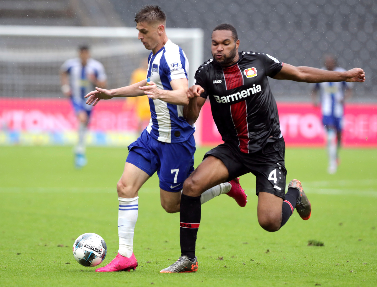 Soccer Football - Bundesliga - Hertha BSC v Bayer Leverkusen - Olympiastadion, Berlin, Germany - June 20, 2020 Berlin's Peter Pekarik in action with Leverkusen's Leon Bailey, following the resumption of play behind closed doors after the outbreak of the coronavirus disease (COVID-19) Michael Sohn/Pool via REUTERS Soccer Football - Bundesliga - Hertha BSC v Bayer Leverkusen - Olympiastadion, Berlin, Germany - June 20, 2020 Berlin's Peter Pekarik in action with Leverkusen's Wendell, following the resumption of play behind closed doors after the outbreak of the coronavirus disease (COVID-19) Michael Sohn/Pool via REUTERS