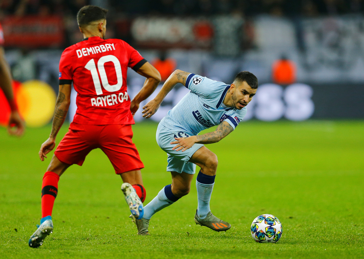 Soccer Football - Champions League - Group D - Bayer Leverkusen v Atletico Madrid - BayArena, Leverkusen, Germany - November 6, 2019 Atletico Madrid's Angel Correa in action with Bayer Leverkusen's Kerem Demirbay REUTERS/Thilo Schmuelgen