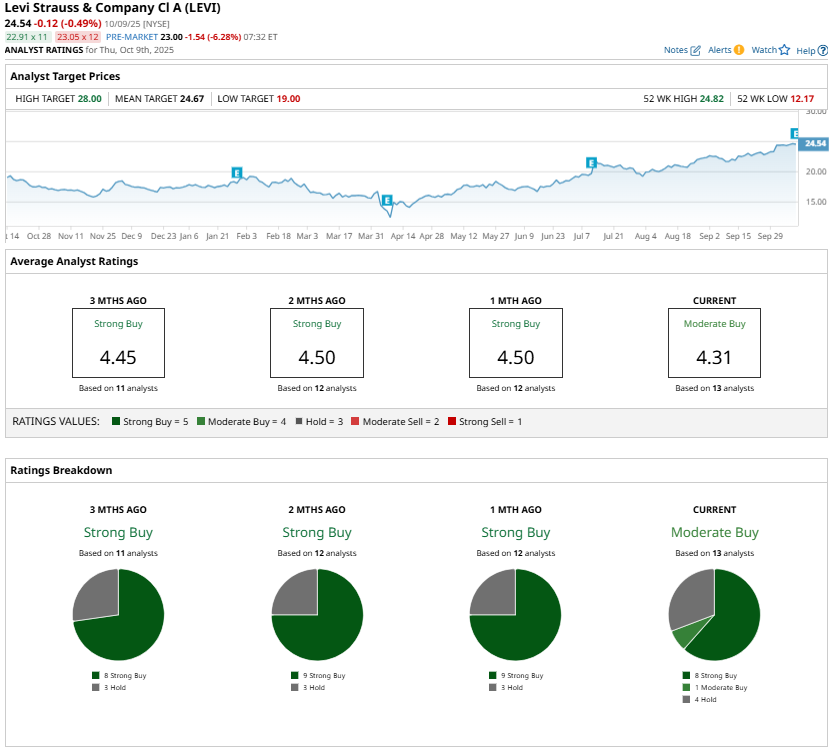 From a valuation standpoint, Levi’s stock trades at a forward price-to-earnings multiple of about 18.9x, a reasonable level given analysts’ expectations for double-digit earnings growth by 2026. Wall Street remains moderately bullish, with a consensus “Moderate Buy” rating, reflecting confidence that Levi’s long-term strategy can sustain momentum even as short-term pressures play out.