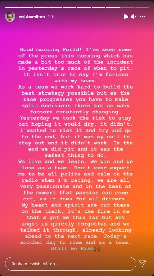 But in a social media post on Monday, Hamilton said: “Don’t ever expect me to be all polite and calm on the radio when I’m racing.