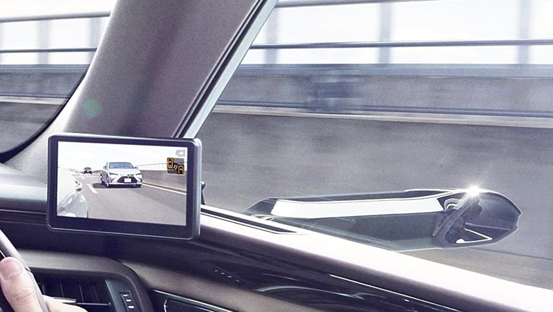 Cameras are equipped to areas where side mirrors are usually located and capture views of the vehicles' sides and back, which are shown on monitors set in front of the driver's and front passenger's seats within the cabin.