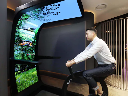 LG’s “Virtual Ride” product concept definitely dwarfs Peloton’s single-screen design by featuring three vertical 55-inch flexible monitors that wrap above the rider. This novel design is meant to give the user full immersion, even it feels weirdly reminiscent of that one Black Mirror episode.