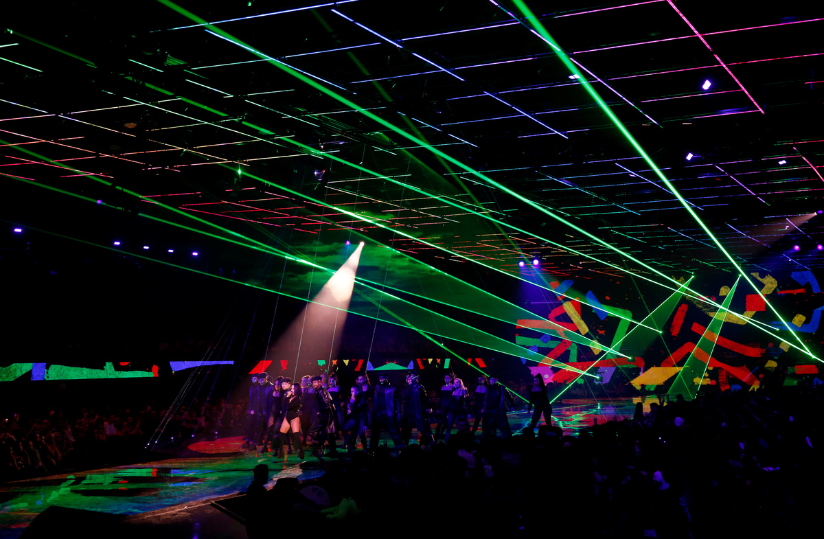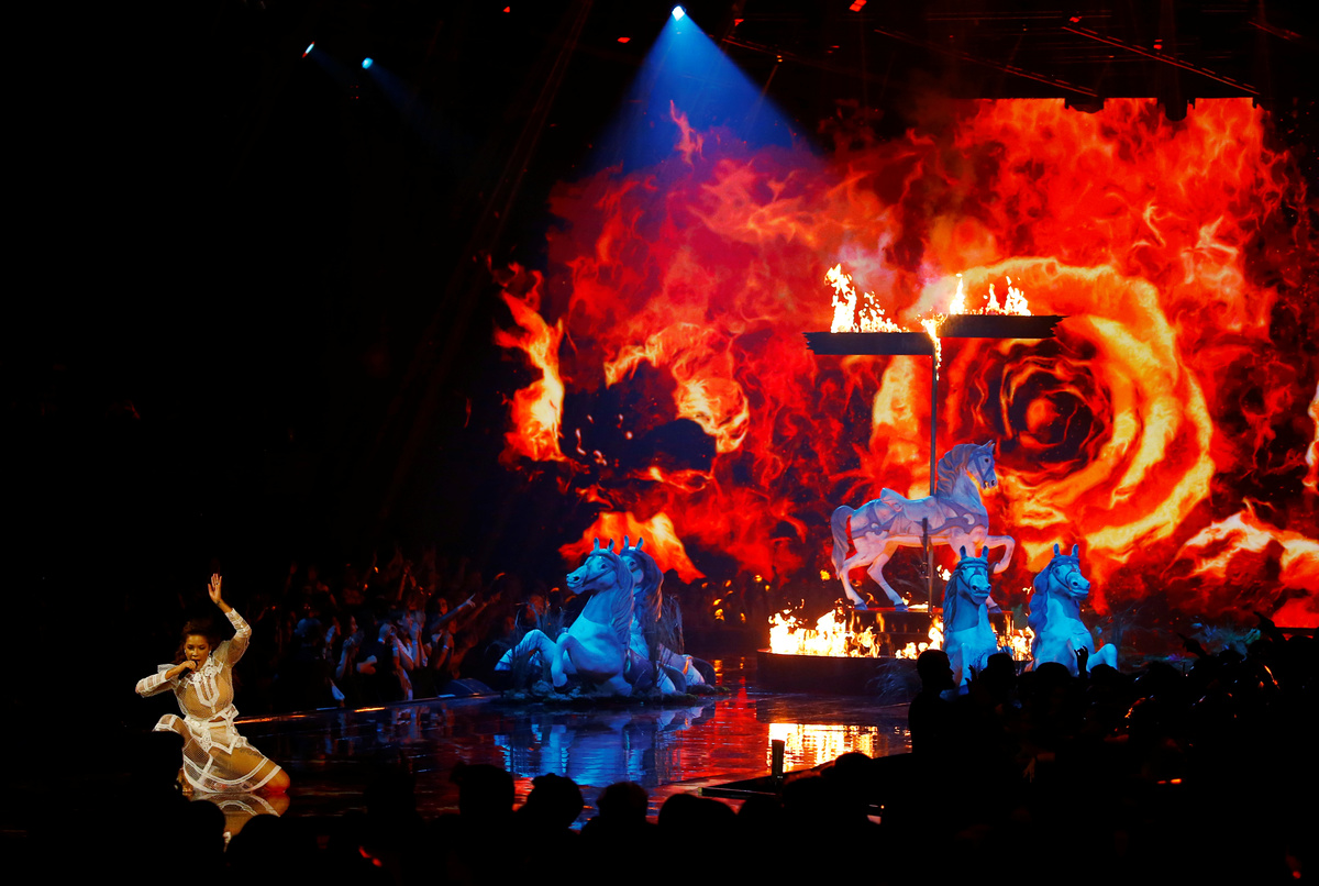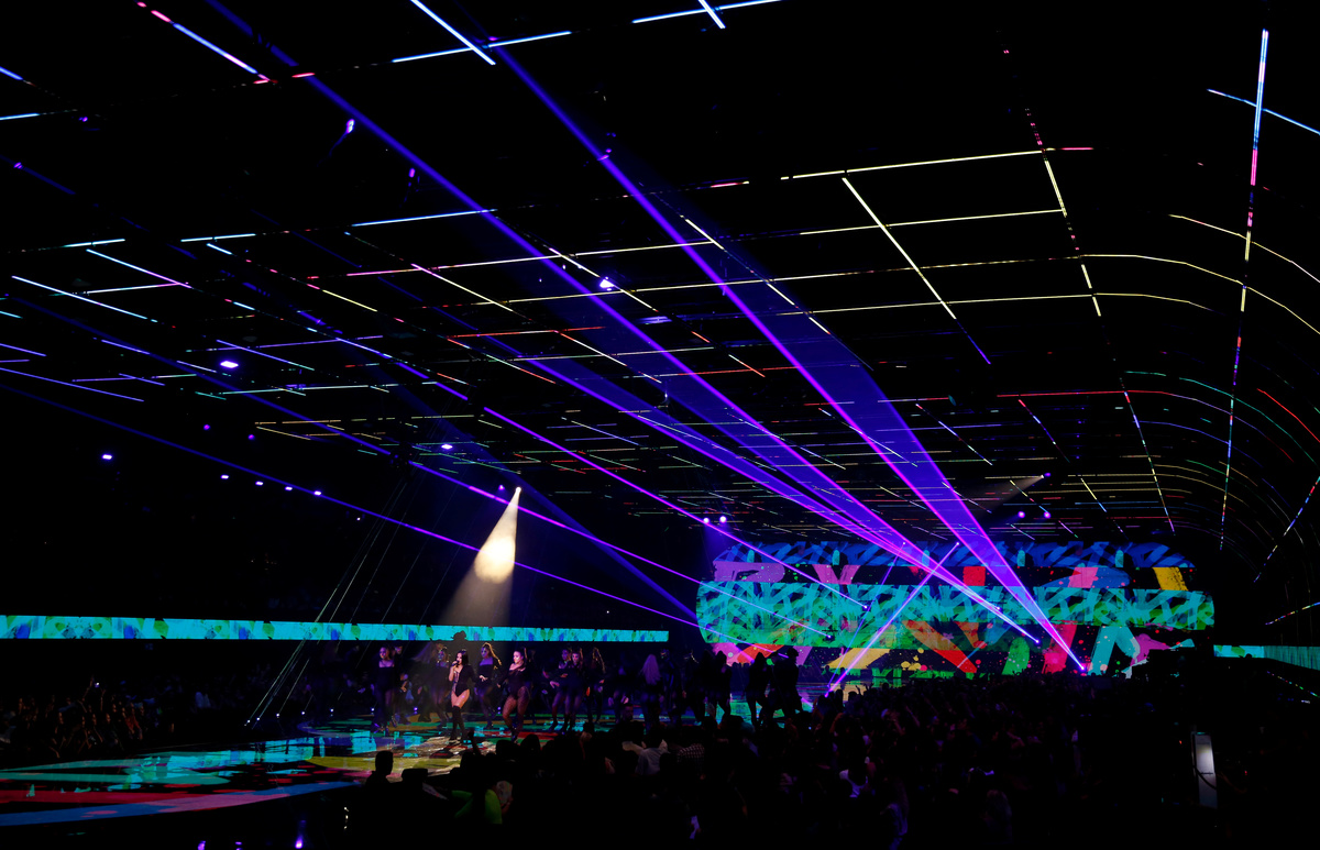 The show at Seville's FIBES Conference and Exhibition centre also saw the first global performance of "Como No", the reggaeton hit by Akon and Becky G. She later performed a medley of her hits including "24/7", "Sin Pijama" and "Mayores".