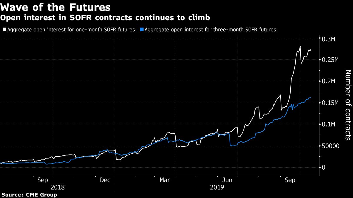That pickup in activity is good news for the Alternative Reference Rates Committee -- convened by the Fed to spearhead the Libor transition in the U.S. One of the biggest obstacles to broader SOFR adoption cited by market participants has been the lack of a term structure associated with the benchmark. Greater turnover in monthly and quarterly futures introduced last year should facilitate the creation of additional tenors, eventually producing a curve that reflects expectations for where the rate will be in the future.