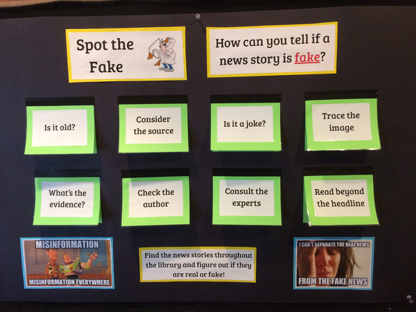 Lakeside's high-school librarians put up a display in the entrance to their building that offers several tips for spotting fake news. One says: "What's the evidence?" Underneath a flap there's more detail: "As you read an article, make sure to see if they have any evidence to back up their claims. Furthermore, research the evidence to see if it is real, made up, or used in a way not intended by its creators."