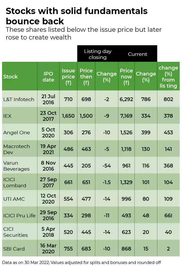 There are also stocks which opened below the issue price but rose because of the inherent value in the company and a clear path to profitability. A good example of this is L&T Infotech which was listed in July 2016 at a price of Rs 698, 2% below the issue price of Rs 710. The stock is now up almost 800% from this level.