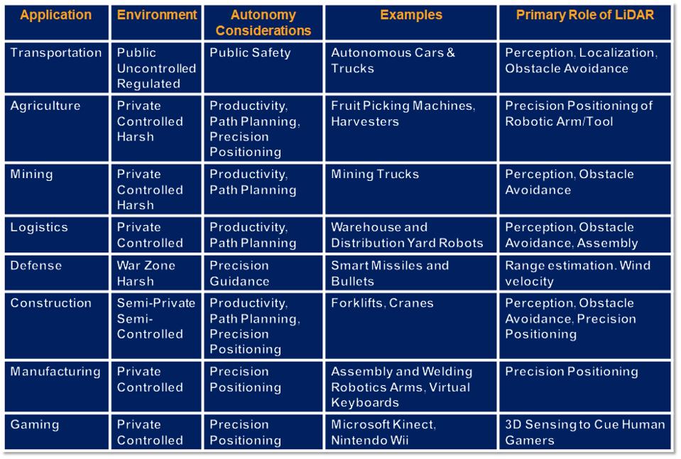 The most publicized examples of AoT are autonomous vehicles and trucks (AVs), and the role and necessity of LiDAR for enabling this application in public spaces has been reported extensively. The focus of the current article is to examine how LiDAR impacts AoT in other applications like construction, logistics, mining, manufacturing, agriculture, medicine and gaming. In these cases, the primary role of LiDAR is to enable perception for moving things - robotic arms, robots, machines, industrial equipment, tools, etc. Unlike AVs where the primary function of the LiDAR is to provide a unique perception modality to enable safe operation, these other applications have productivity, efficiency and precision positioning/guidance as their primary goals (Table 1). LiDAR enables these goals by providing 3D sensing of various objects or things in the environment. Gaming is slightly different in that the LiDAR senses the human body to adjust and cue the gamer - in this case, the “thing” is a human!