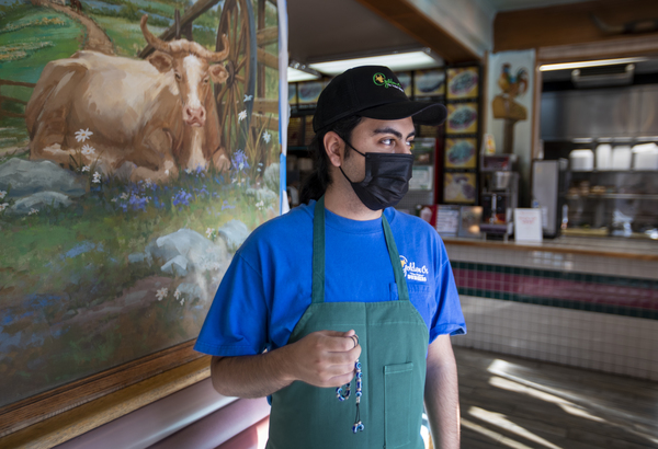 Now, plexiglass divides workers from customers, who have their temperatures taken at the door before picking up food to go. The staff has been cut in half. People walk by less and less. And he fidgets more and more with the worry beads he carries all the time in this pandemic year.