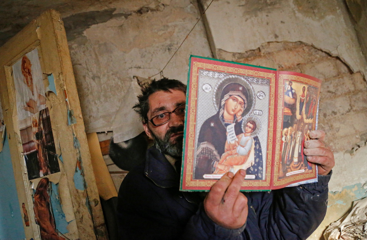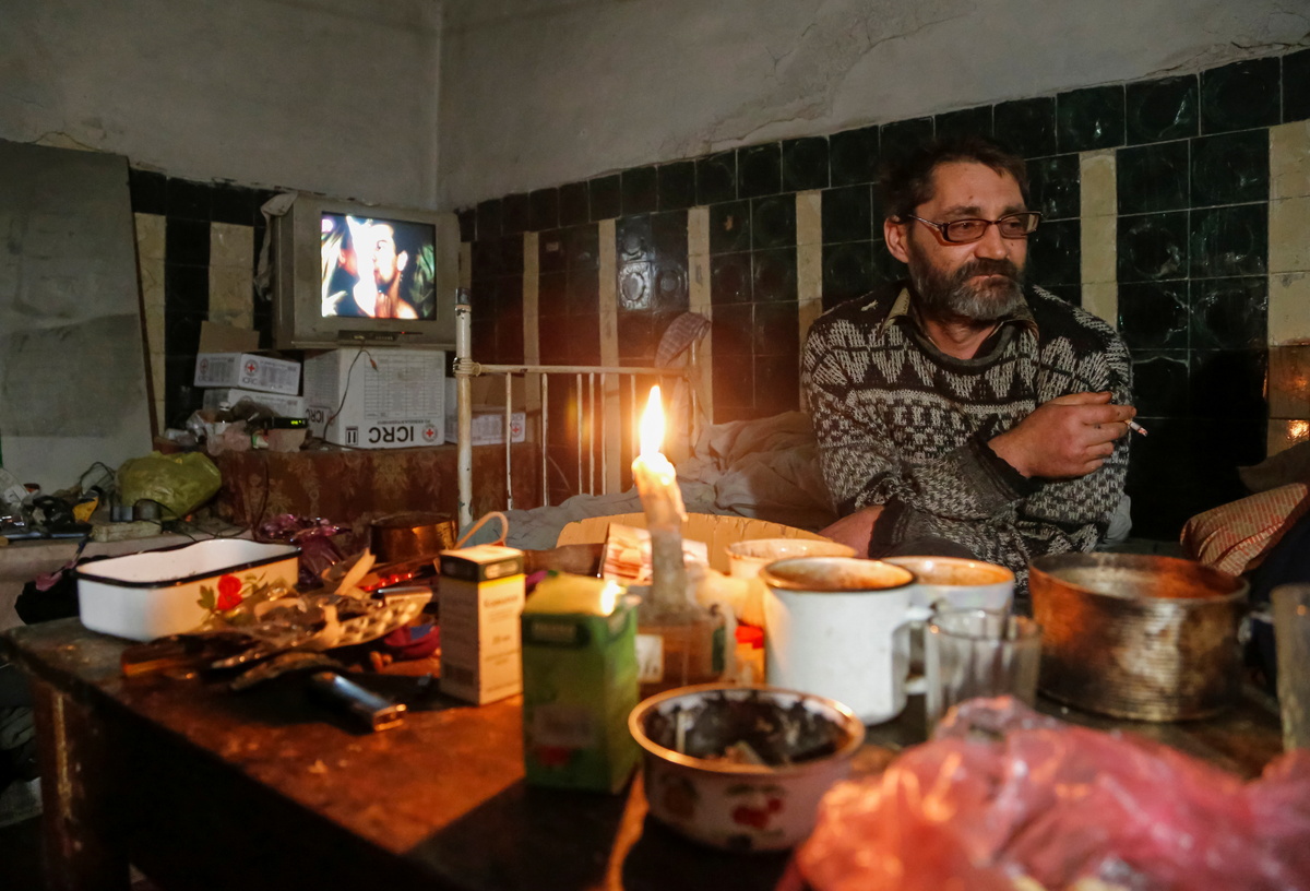 Aleksander Studenikin and his wife live in the basement of a ruined school, with a candle burning on the table and an old TV set in the corner. Their own house was destroyed by shelling in July 2014.