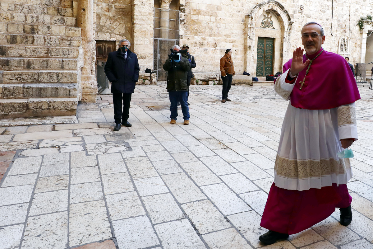 After walking through a deserted Old City bathed in early morning sunlight, a purple-robed Archbishop Pierbattista Pizzaballa, the Vatican’s apostolic administrator in the Holy Land, spoke briefly outside the church: