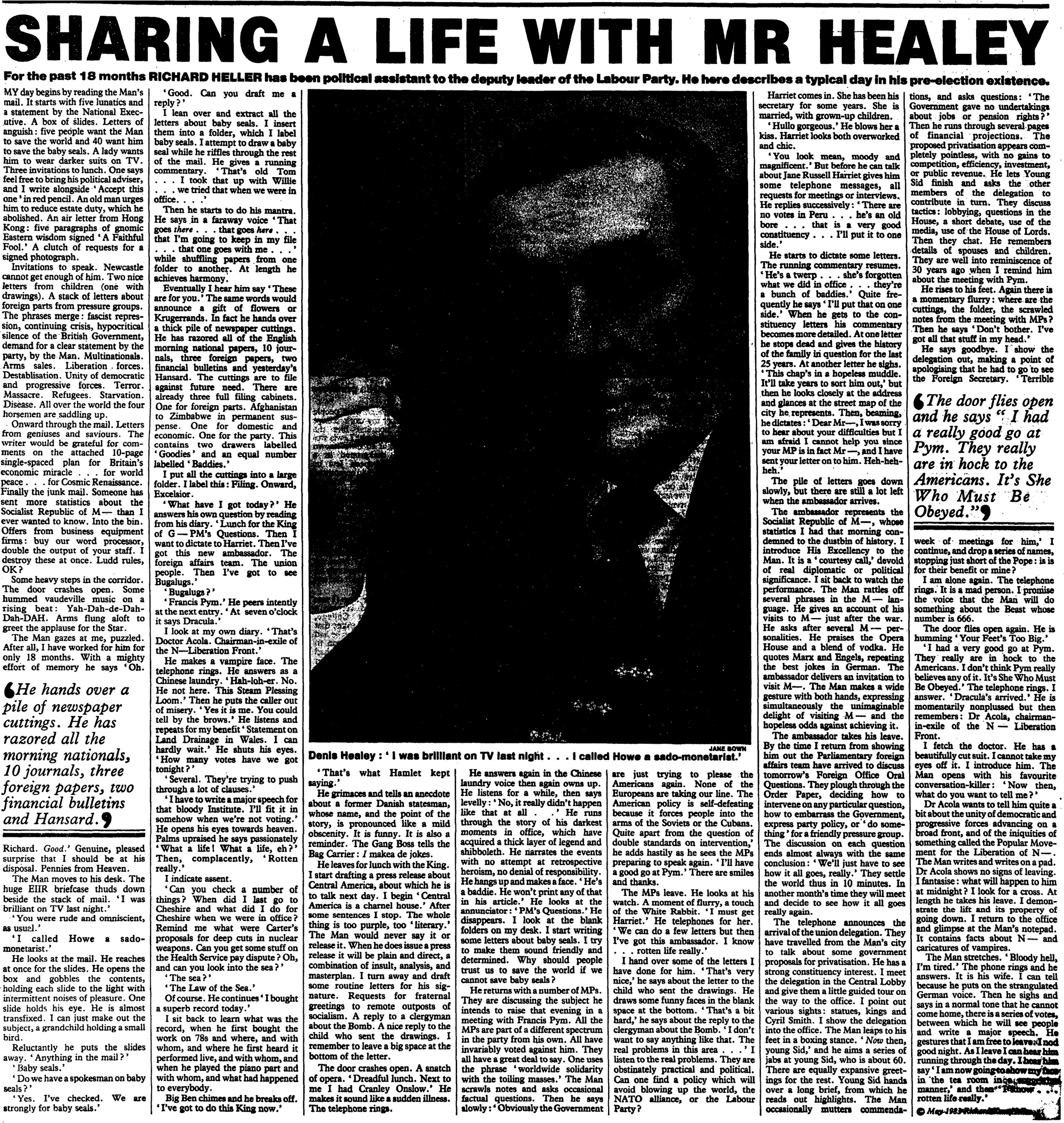 My day begins by reading the Man’s mail. It starts with five lunatics and a statement by the National Executive. A box of slides. Letters of anguish: five people want the Man to save the world and 40 want him to save the baby seals. A lady wants him to wear darker suits on TV. Three invitations to lunch. One says feel free to bring his political adviser, and I write alongside ‘Accept this one’ in red pencil. An old man urges him to reduce estate duty, which he abolished. An air letter from Hong Kong: five paragraphs of gnomic Eastern wisdom signed ‘A Faithful Fool.’ A clutch of requests for a signed photograph.