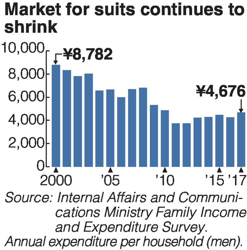 The market for suits has been shrinking due to various factors, including the spread of "cool biz" office wear. The average household spent 4,676 yen on men's suits in 2017, nearly a 50 percent decline from the 8,782 yen that was spent in 2000, according to the Internal Affairs and Communications Ministry's Family Income and Expenditure Survey.