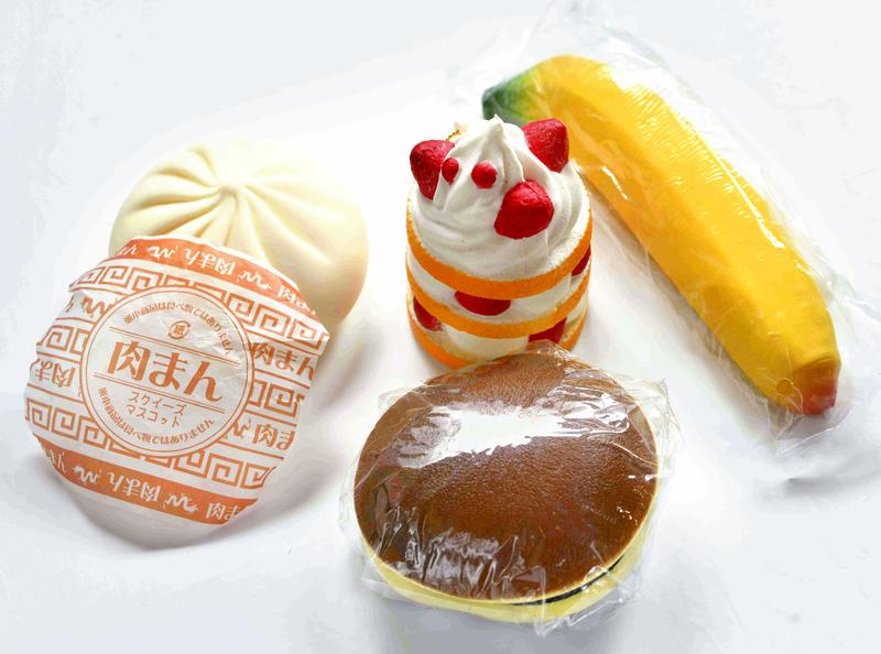 Squeezable items made from resin are popular among young women. Realistic reproductions of fruits, sweets and other things, they can be squeezed or pulled out long, bringing a refreshing change of pace during work.