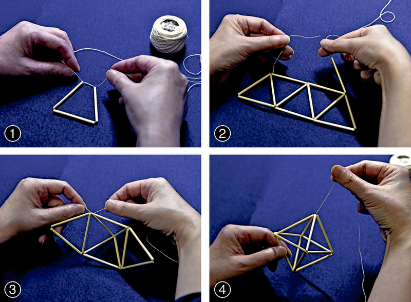 Making an octahedron is recommended for beginners. Cut a straw into three at equal lengths, set them in the shape of a triangle, pass a thread through them and tie the two top ends tightly together so the three straw parts firmly make a triangle (Photo 1).