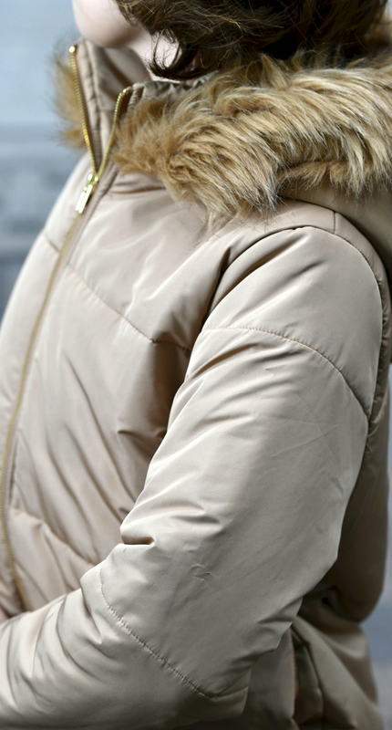 One beige down coat has fewer stitches than conventional ones and doesn't look puffy. It goes well with such fashion items as a black floral dress. The hem of the skirt moves when walking, adding an impression of lightness to the outfit. The down coat also is a good match with a blue, gray or brown pleated skirt.