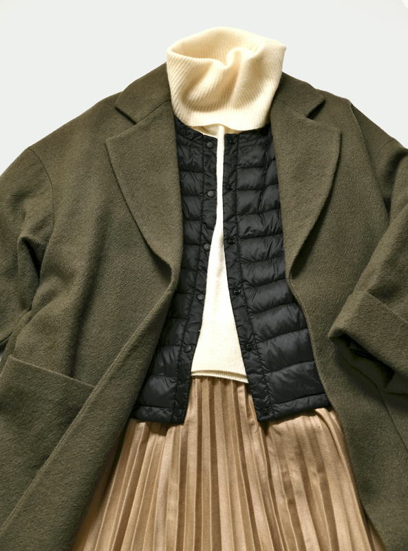 Thin down clothes containing less down than usual have been getting attention recently. They can be used as outerwear or worn underneath a coat. Having one in your closet is handy, as it can be worn from autumn through spring. This kind of item comes in various colors, silhouettes and lengths.