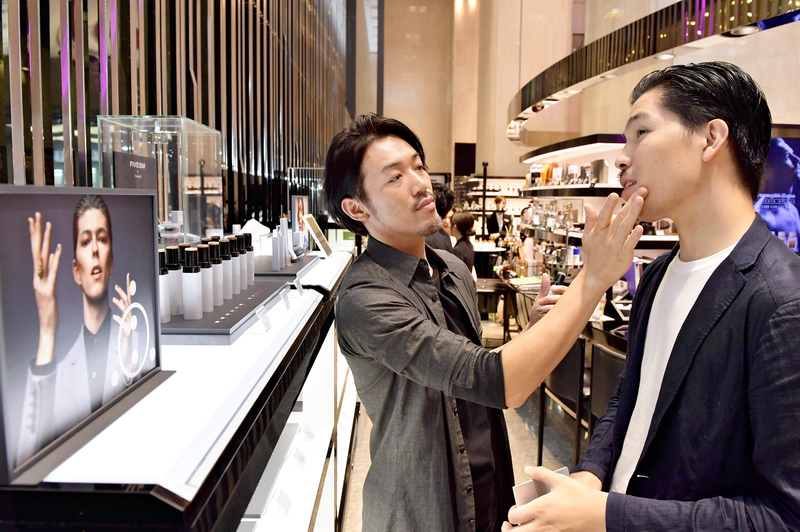 "It makes my face look smaller," a male university freshman, 19, said in surprise, examining the results of his first-ever makeup experience at the cosmetics counter of Hankyu Men's Tokyo in the Yurakucho district of Tokyo. A store employee had applied several products from Fiveism x Three, a men's brand made by Acro Inc., a subsidiary of Pola Orbis Holdings Inc.