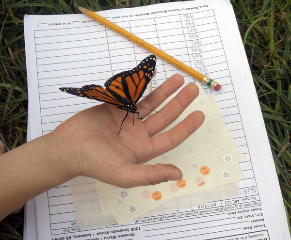 As monarchs flitted through the flowers, taking nutrition breaks on their way south, Spencer and her protege removed new adults from a cage and put stickered ID labels on their wings.