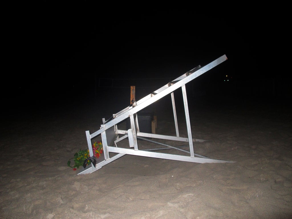 A handwritten note in purple ink was left with flowers Monday night at the base of a lifeguard stand at the beach.