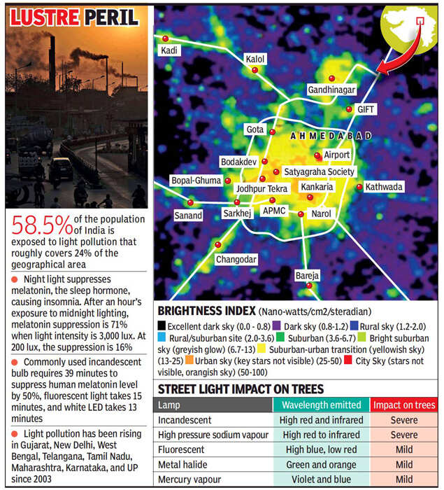 AHMEDABAD: Not many institutions have studied the impact of night-time light pollution on individuals, trees, birds, and insects in our cities. But a collaborative study of IIT-Kharagpur; School of Planning and Architecture, Bhopal; and ITM University, Gwalior, has cited research on night-time lights suppressing melatonin, the sleep hormone, and causing insomnia.