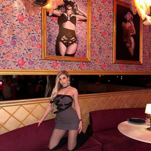 In the first image, Lika is seen donning a chic dress paired with sleek black knee-high boots. Her radiant smile and poised pose while resting her knees on a sofa exude elegance and grace. The backdrop of the photo is adorned with striking images of models, creating a trendy and fashionable setting that complements Lika's outfit perfectly.