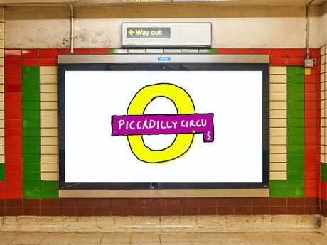 As seen in the pictures, the A Bigger Splash artist’s design comprises a digital recreation of the London Underground’s signage for Piccadilly Circus, with the letter “s” added at a tangent, as if the artist hadn’t accounted for how much room the word would take up.