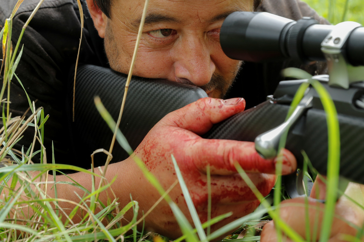 As the first beast slumps, he rapidly draws back and pushes forward his riflebolt, firing again and then a third time. In seconds, three cattle are dead on the damp ground. He gathers his knives and begins to cut them up.