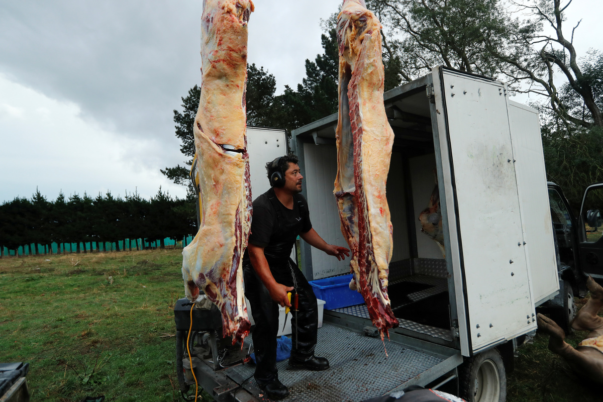 Wearing black overalls and gumboots for protection against the gore, he pushes the cattle on their sides, removes heads and hide and uses a hoist to load the carcasses on his refrigerated truck.