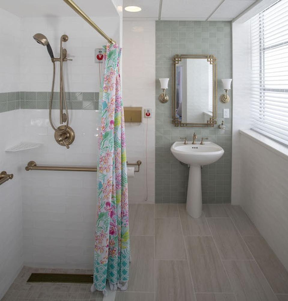 While hospital bathrooms aren't exactly known for being high end, the bathroom in the Lilly Pulitzer VIP Suite is easily mistaken for that of a seaside hotel. White and green textured tiles round out the Lilly look and truly compliment the gold faucets, hardware, and mirror frame.