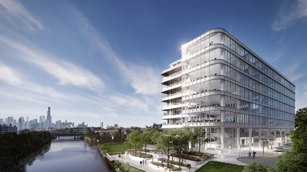 Every floor has an open-air terrace, in keeping with demand for outdoor workspace that the pandemic has intensified. With no neighboring high-rises, copious amounts of morning sun will pour into the terraces. The building will have a landscaped plaza down to the river.