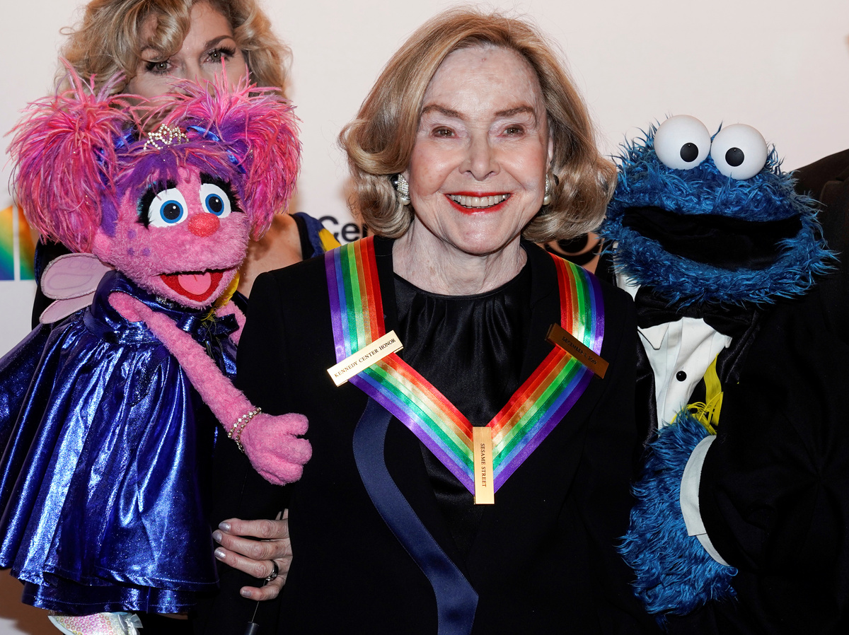 Sesame Street co-creator Joan Ganz Cooney poses with Abby Cadabby and the Cookie Monster as she arrives for the 42nd Annual Kennedy Awards Honors in Washington, U.S., December 8, 2019. REUTERS/Joshua Roberts