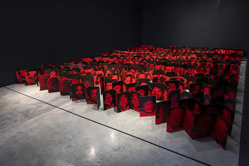 Her 2003 installation, Birth and Death, recreated for this exhibition, comprises 100 red, Chinese accordion books, printed with digitised images of members of her family, past and present, alive and dead. We are all a part of those who go before and who come after.