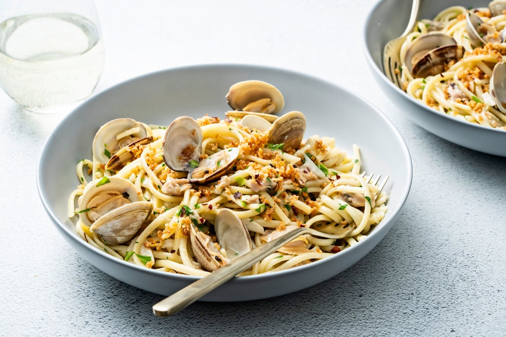 Divide the pasta among the bowls, topping each bowl with the reserved clams in the shell. Evenly divide the bread crumbs over the pasta and serve.