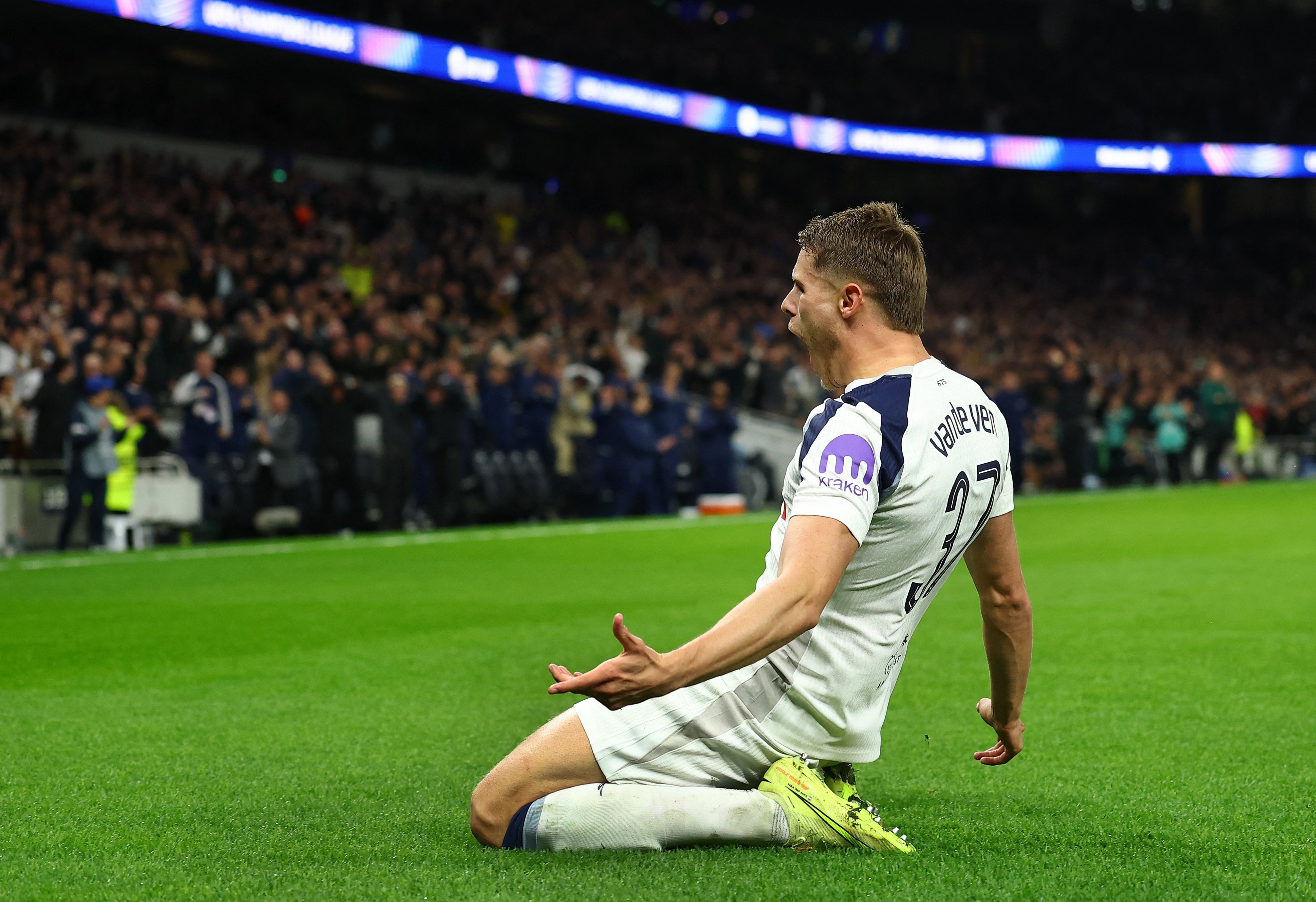 With Spurs leading 2-0, but having just gone down to 10 men following Brennan Johnson’s red card, Van de Ven sealed the points in the Champions League clash with a remarkable solo effort.