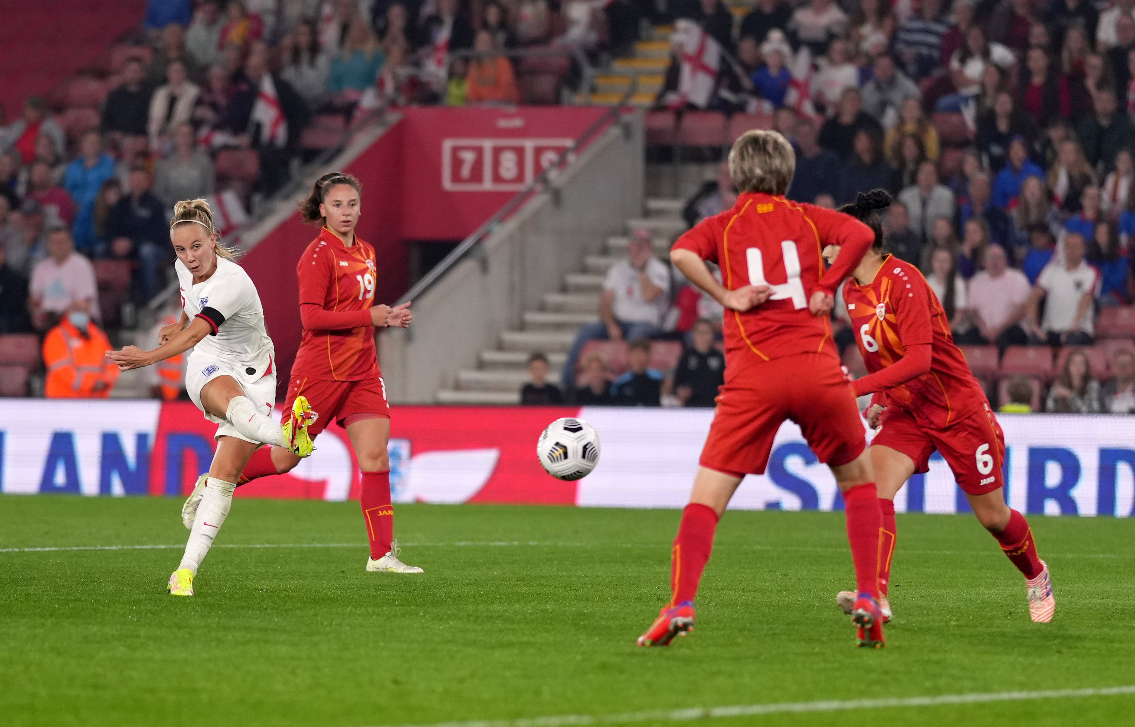 The Lionesses ran out 8-0 winners in an utterly one-sided World Cup qualifier at St Mary’s as Ellen White and Beth England helped themselves to braces with Ella Toone and Beth Mead also on target
