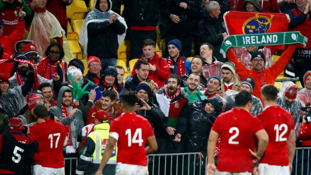 Rugby Union - New Zealand All Blacks v British and Irish Lions - Lions Tour - Westpac Stadium, Wellington, New Zealand - July 1, 2017 Lions fans celebrate at the end of the match. REUTERS/David Gray