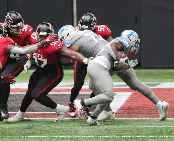 Atlanta Falcons running back Todd Gurley (21) gets past Detroit Lions safety Will Harris and tries, unsucessfully, to stop short of the end zone to control the final minutes of the clock in the fourth quarter on Sunday, Oct. 25, 2020, at Mercedes-Benz Stadium in Atlanta. The Lions won, 23-22. (Curtis Compton/Atlanta Journal-Constitution/TNS)Now even the Falcons' own touchdowns are turning against them with Detroit Lions defenders pointing out the football broke the plane of the goal line as Falcons running back Todd Gurley trys to stop from scoring in the final minutes of a 23-22 loss to the Lions in an NFL football game on Sunday, Oct 25, 2020 in Atlanta. (Curtis Compton/Atlanta Journal-Constitution/TNS)Atlanta Falcons running back Todd Gurley gets some hard yards against the Detroit Lions during the second half in an NFL football game on Sunday, Oct 25, 2020 in Atlanta. (Curtis Compton/Atlanta Journal-Constitution/TNS)Atlanta Falcons Matt Ryan walks off the field after being strip sacked and turning it over to the Detroit Lions during the 4th quarter in an NFL football game on Sunday, Oct 25, 2020 in Atlanta. (Curtis Compton/Atlanta Journal-Constitution/TNS)Detroit Lions kicker Matt Prater makes the extra point attempt to beat the Atlanta Falcons, 23-22, with Falcons cornerback A.J. Terrell (24) looking on as time expires on Sunday, Oct. 25, 2020, at Mercedes-Benz Stadium in Atlanta. (Curtis Compton/Atlanta Journal-Constitution/TNS)Atlanta Falcons quarterback Matt Ryan (2) hands off to running back Todd Gurley (21) for a 1-yard touchdown run against the Detroit Lions during the second quarter on Sunday, Oct. 25, 2020, at Mercedes-Benz Stadium in Atlanta. (Curtis Compton/Atlanta Journal-Constitution/TNS)Detroit Lions linebacker Jamie Collins (58) signals touchdown as Atlanta Falcons running back Todd Gurley (21) trys to stop short of the end zone to control the final minutes of the clock in the fourth quarter on Sunday, Oct. 25, 2020, at Mercedes-Benz Stadium in Atlanta. The Lions won, 23-22. (Curtis Compton/Atlanta Journal-Constitution/TNS)Atlanta Falcons cornerback Kendall Sheffield (20) reacts as Detroit Lions tight end T.J. Hockenson, top left, makes an 11-yard touchdown catch as time expires on Sunday, Oct. 25, 2020, at Mercedes-Benz Stadium in Atlanta. The Lions won, 23-22. (Curtis Compton/Atlanta Journal-Constitution/TNS)Detroit Lions kicker Matt Prater (5) watches his extra point attempt sail through the uprights to beat the Atlanta Falcons, 23-22, as time expires on Sunday, Oct. 25, 2020, at Mercedes-Benz Stadium in Atlanta. (Curtis Compton/Atlanta Journal-Constitution/TNS)Atlanta Falcons running back Todd Gurley (21) gets past Detroit Lions safety Will Harris and tries, unsucessfully, to stop short of the end zone to control the final minutes of the clock in the fourth quarter on Sunday, Oct. 25, 2020, at Mercedes-Benz Stadium in Atlanta. The Lions won, 23-22. (Curtis Compton/Atlanta Journal-Constitution/TNS)Falcons running back Todd Gurley slips away from Lions defender Will Harris and then trys in vain to stop short of the endzone and not score to control the final minutes of the clock in the fourth quarter of an NFL football game on Sunday, Oct 25, 2020 in Atlanta. Gurley broke the plane for a touchdown for a 20-16 lead and the Falcons added the 2-point conversion to extend the lead to 22-16 but left enough time for the Lions to come back for the game winning touchdown and extra point to beat the Falcons 23-22. (Curtis Compton/Atlanta Journal-Constitution/TNS)Falcons running back Todd Gurley trys in vain to stop short of the endzone and not score against the Lions to control the final minutes of the clock in the fourth quarter of an NFL football game on Sunday, Oct 25, 2020 in Atlanta. Gurley broke the plane for a touchdown for a 20-16 lead and the Falcons added the 2-point conversion to extend the lead to 22-16 but left enough time for the Lions to come back for the game winning touchdown and extra point to beat the Falcons 23-22. (Curtis Compton/Atlanta Journal-Constitution/TNS)Detroit Lions linebacker Jamie Collins signals touchdown as Falcons running back Todd Gurley trys to stop short of the endzone to control the final minutes of the clock in the fourth quarter of an NFL football game on Sunday, Oct 25, 2020 in Atlanta. Gurley broke the plane for a touchdown for a 20-16 lead and the Falcons added the 2-point conversion to extend the lead to 22-16 but left enough time on the clock for the Lions to come back for the game winning touchdown and extra point to beat the Falcons 23-22 as time expired. (Curtis Compton/Atlanta Journal-Constitution/TNS)Detroit Lions running back D'Andre Swift, right, slips away from the grasp of Atlanta Falcons defender Grady Jarrett for a first-quarter touchdown on Sunday, Oct. 25, 2020, at Mercedes-Benz Stadium in Atlanta. (Curtis Compton/Atlanta Journal-Constitution/TNS)Atlanta Falcons running back Todd Gurley (21) scores on a 1-yard touchdown against the Detroit Lions during the second quarter on Sunday, Oct. 25, 2020, at Mercedes-Benz Stadium in Atlanta. (Curtis Compton/Atlanta Journal-Constitution/TNS)