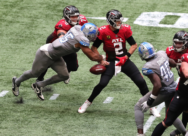 Detroit Lions defensive end Romeo Okwara, left, gets past tackle Jake Matthews to strip sack Atlanta Falcons quarterback Matt Ryan (2), with the Lions recovering during the fourth quarter on Sunday, Oct. 25, 2020, at Mercedes-Benz Stadium in Atlanta. The Lions won, 23-22. (Curtis Compton/Atlanta Journal-Constitution/TNS)